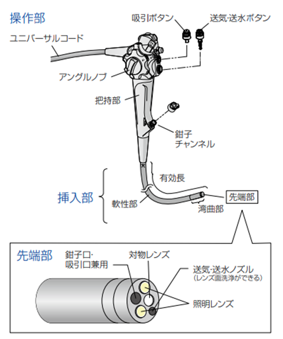 鉗子チャンネルは、術者がスコープを保持する手元についており、スコープの中を通り、スコープ先端に繋がっています。(出口を鉗子口と呼びます)