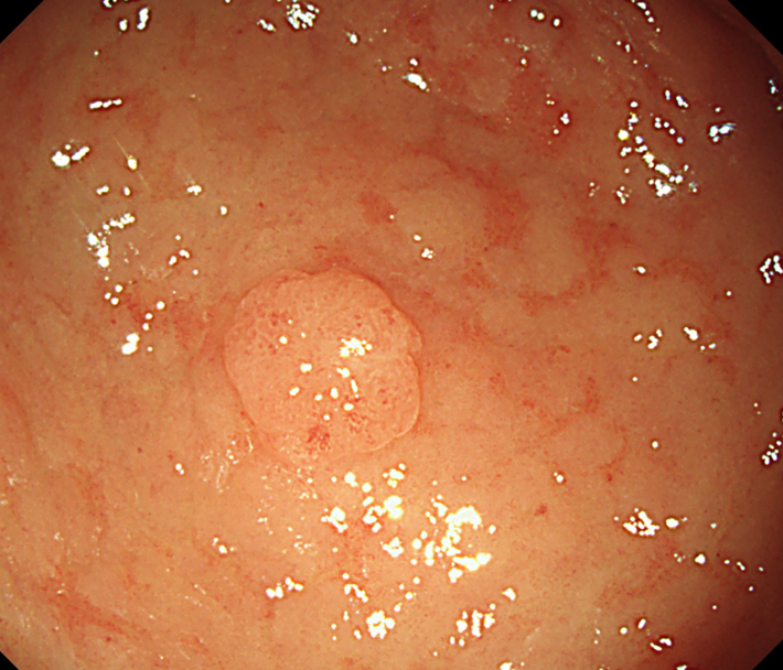 今年の検査では昨年までには見られなかった7mm程度の扁平な隆起性病変が出現しており、生検にて早期胃がんの診断となりました。