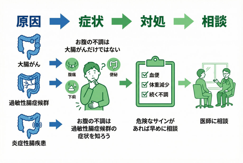 大腸がん以外の病気が原因である可能性 腹痛や便通異常といった症状は、大腸がん特有のものではありません。 ストレスなどが関係する過敏性腸症候群(IBS)や、腸に炎症が起きる潰瘍性大腸炎といった他の病気が原因で起こることも多くあります。
