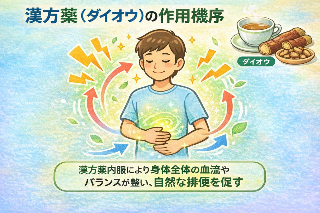 | 漢方薬 | 大黄甘草湯 | ツムラ84など | 大黄による大腸刺激作用 | 即効性あり/短期使用向き | 腹痛、下痢、低K血症 |