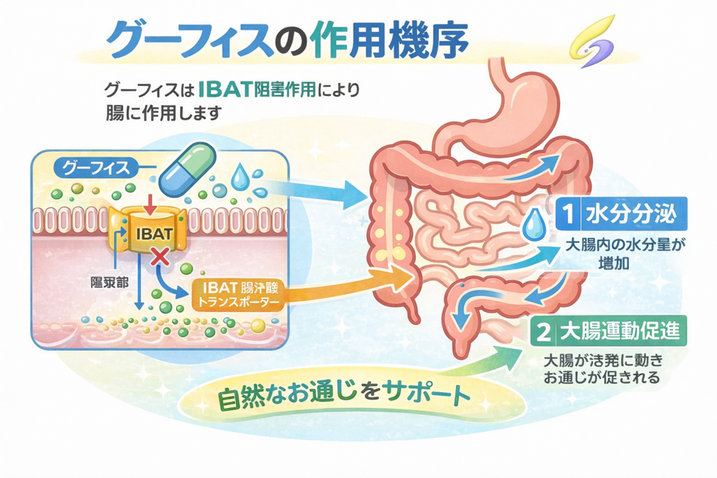 | 胆汁酸トランスポーター阻害薬 | グーフィス | 胆汁酸の再吸収を阻害し、大腸への流入量を増やすことで排便を促す。 | 体内物質を利用するため、自然に近い排便が期待できる。 |