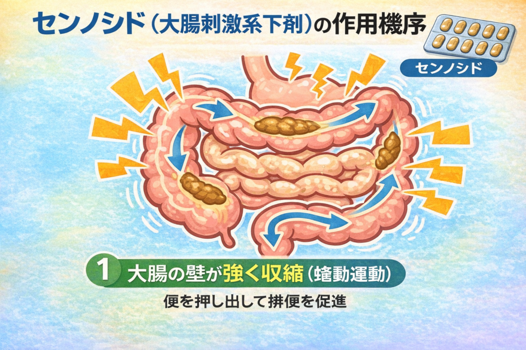 | 刺激性下剤 | センノシド | プルゼニド® | 大腸神経叢を刺激し蠕動運動促進 | 即効性あり/頓用向き | 腹痛、下痢、連用で耐性 |
