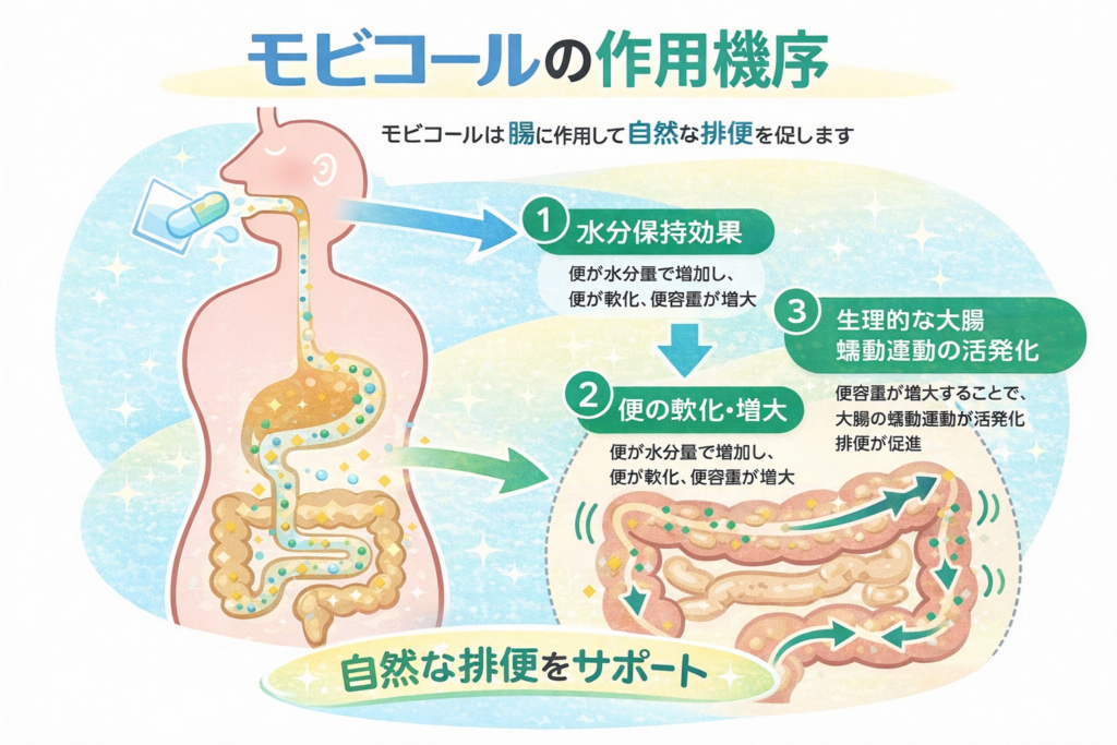 モビコールは「浸透圧性下剤」という、便の水分を増やすタイプの薬です。 主成分のポリエチレングリコール(PEG)が、ユニークな働きをします。 この成分は水分子と強く結びつき、腸の中で水分をしっかり抱え込みます。