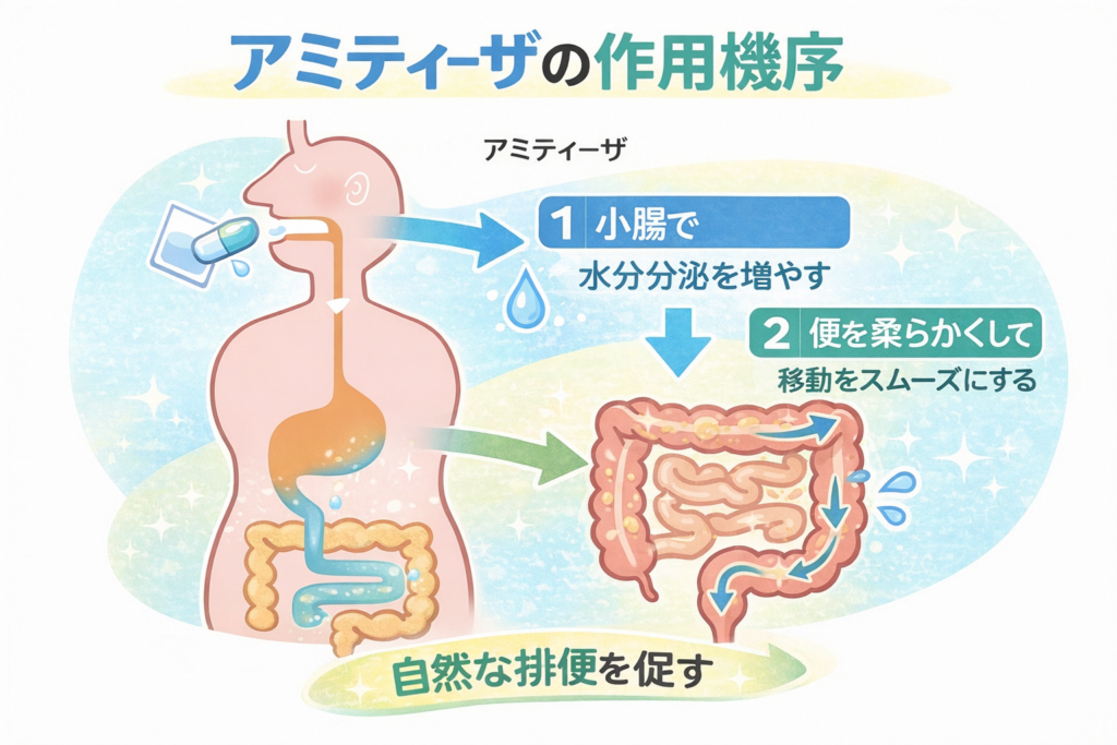 小腸や大腸の上皮細胞に存在するクロライドチャネル(ClC-2)を活性化することで作用します。 このチャネルは、腸管内へ塩化物イオンと水分を分泌する“通り道”のような役割を担っています。 アミティーザにより腸管内の水分量が増加し、便が柔らかくなることで、排便がスムーズになります。 その結果、強い刺激を与えることなく、自然に近い形で排便を促すことができます。 慢性便秘症や、便が硬く出にくいタイプの便秘に有効とされています。 体内への吸収はごくわずかで、全身性の副作用が比較的少ない点も特徴です。