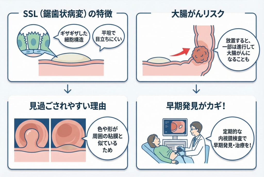 - 従来の一般的な腺腫性ポリープと同時にSSLが見つかる場合も、癌化リスクが高まることが指摘されています。