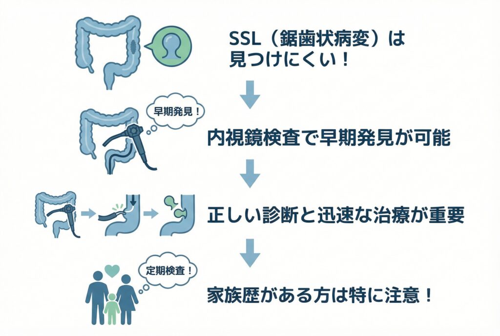 消化器内科医の立場から見ても、SSLは発見に専門的な知識と経験、そして最新の内視鏡技術が求められる病変です。ご自身の健康を守るために、SSLについて正しい知識を持つことが非常に大切になります。