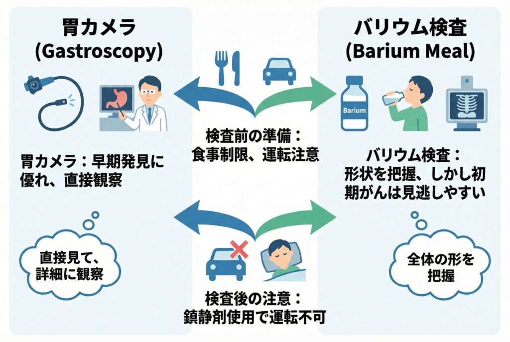 胃の不調を感じた時や、健康診断で胃の検査を勧められた時、多くの方が「胃カメラとバリウム検査、どちらを選べば良いのだろう」と迷われることでしょう。どちらの検査も胃の健康状態を調べるために非常に大切ですが、それぞれに異なる特徴と目的があります。この二つの検査の基本的な違いを深く理解し、ご自身の状態や目的に合わせて安心して検査に臨めるよう、具体的な内容を分かりやすくお伝えします。