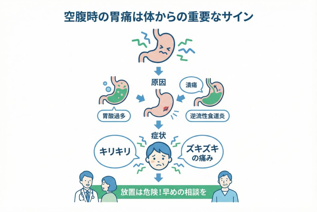空腹時に胃がキリキリ、ズキズキと痛む経験は、多くの方が一度はされたことがあるのではないでしょうか。この「お腹が空いたから」と見過ごしがちな胃痛は、実は体が発している重要なサインかもしれません。